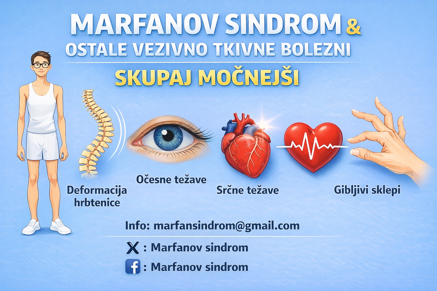 Poleg tega pa smo na voljo za več informacij o Marfanovem sindromu, Ehlers Danlosovih sindromih, Loeytz Dietz sindromu ter ostalih redkih bolezni preko kontakta marfansindrom@gmail.com
